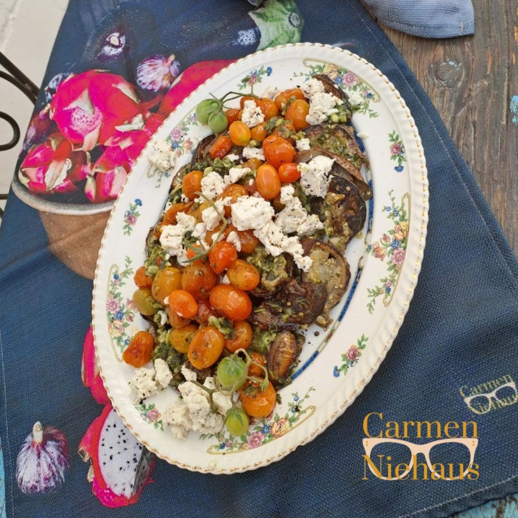 Die veelsydigheid van hierdie pesto ken nie perke nie – roer dit by pasta in en rasper pecorino-kaas oor of skep dit oor geroosterde groente voor dit oond toe gaan; smeer dit oor vis of vleis voor jy dit braai. Saam met gebraaide eiervrug is dit heerlik. Die tamatieplant neffens my agterdeur se oes hou net nie op nie en net skrikgemaak in bietjie olyfolie is dis heerlik saam met die eiervrug.