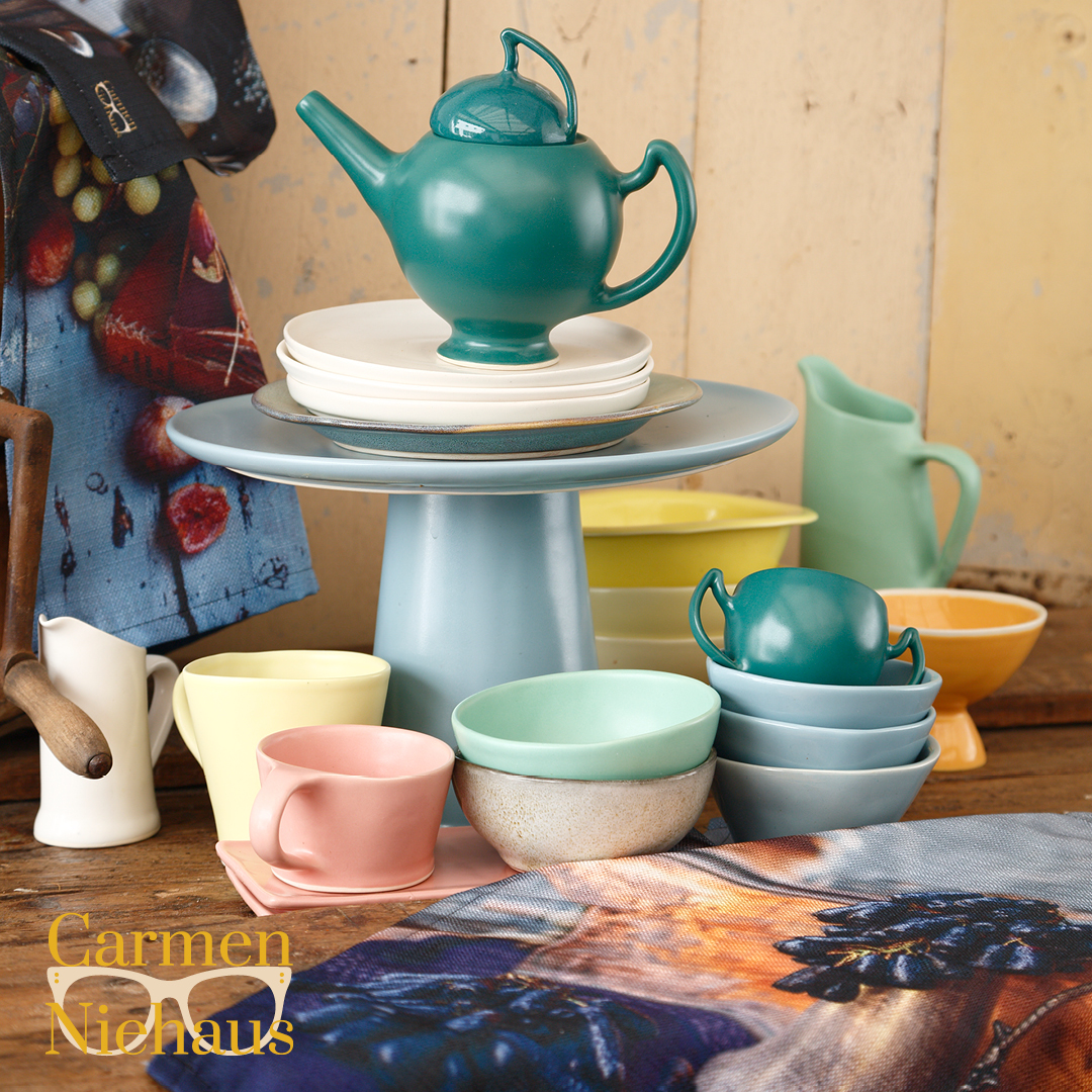 In die studio word nog ‘n tafel staangemaak en al die props daarop uitgepak. Vir eers probeer ek hou by ‘n basiese kleurskema, maar toe die grafiese kunstenaar, Helen Henn, vir my die boekuitleg stuur, begin ek prentjies in my kop vorm en elkeen se props kom sorgvuldig bymekaar – die Mervyn Gers-keramiekware vorm meestal die basis, daarby ‘n geroeste plaatjie wat ek in die middel van die Namib-woestyn opgetel het, die Xhosa-mandjie wat ek gekoop het by ‘n vrou langs die pad wat my vertel die mandjie het haar ma nog spesiaal vir haar geweef, ‘n eierkelkie uit Praag of die messegoed wat my skoonma se trougeskenk was. En natuurlik die lappe en glaskapplanke wat deel vorm van my Carmen Niehaus-reeks, help ook mooimaak en pas mooi in by die Mervyn Gers-ware.