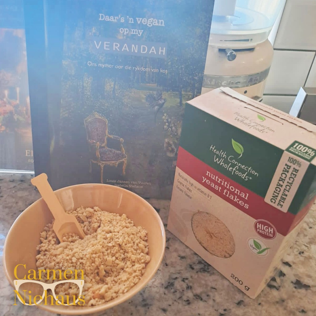 Dis nou ook al ‘n geruime tyd wat ek verskeie resepte wat voedingsgisvlokkies (nutritional yeast) bevat, raaklees. Maar dis nogals my uitgangspunt dat ek nie resepte plaas as mens nie die bestanddele geredelik in ‘n supermark kan kry nie. Toe ek dus nou die dag my hande op ‘n pak voedingsgisvlokkies kan lê by Food Lovers Market het ek dit dadelik ingespan om die neutparmesaan wat in Louis en Isabella se boek is, uit te probeer. ‘n Strooisel daarvan was net reg om die geurige rys tot nuwe hoogtes te verhef.