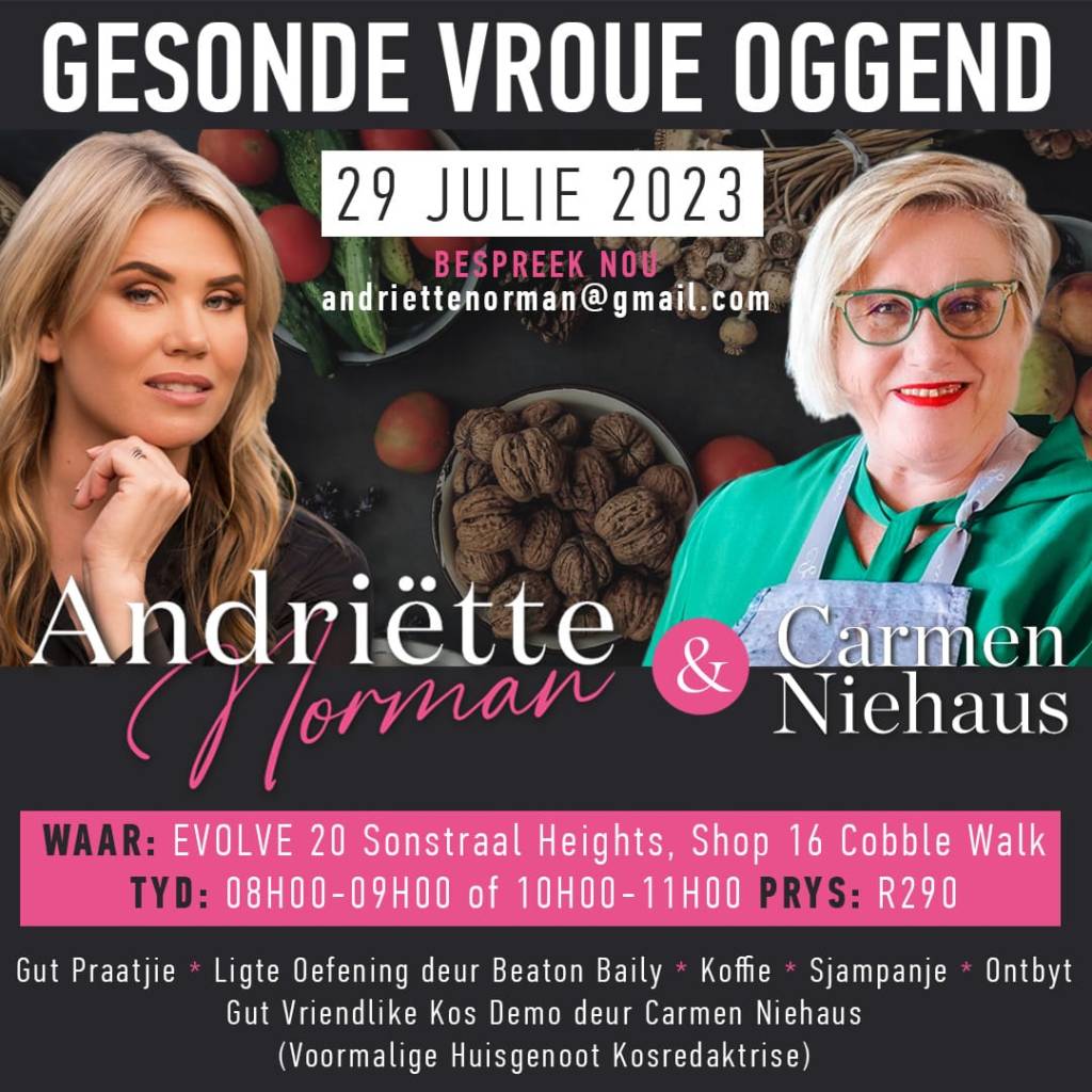 Sowat anderhalf maand gelede het ek toe een van haar inligtingsessies bygewoon, wat terloops gehou is by haar ewe inspirerende man, Glynn Moolman, ‘n biogenetikus, se splinternuwe Evolve 20-gimnasium in die Cobble Walk-sentrum in Sonstraal Heights, Durbanville. Wat ‘n groot lekkerte is dit nou vir my om saam met haar hande te kan vat en gesonde vroueoggende aan te bied waar ek ‘n paar “gut”-vriendelike groentegeregte gaan demonstreer terwyl sy almal meer vertel en motiveer om “gut” vriendelik te eet en te leef. (Ons gaan sommer bietjie oefen ook).