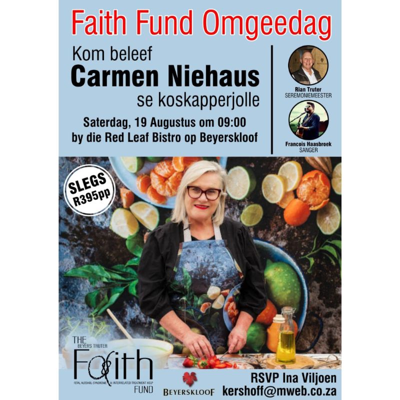 Die Faith Fund doen uitreike na plase en landelike gemeenkappe met hul Klop-Klop projek en ook inligtingsessies. Met die omgeedag wat op 19 Augustus plaasvind, word daar fondse ingesamel om die werk van die Faith Fund asook om 2 klassies vir leerders wat spesiale onderrig benodig, te help befonds. Kom geniet ‘n feestelike kuier-en-ontbytoggend by die Red Leaf-restaurant op Beyerskloof waar ek ‘n paar heerlike geregte gaan demonstreer en julle gaan toelig hoe maklik dit eintlik is om gesond en steeds smullekker te eet. Sien die kontakbesonderhede op die kaartjie.