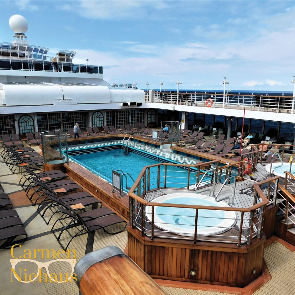 Dis 10 dae op see en gee ons nou behoorlik tyd om die skip van voor tot agter te verken. Ons werk ook vir ons ‘n tipe dagrooster uit om die meeste te maak van die wonderlike warm weer en kalm waters. Gewoonlik het ons die vorige aand die skipkoerant deurgewerk om te sien wat alles die volgende dag op die program is – vir ons was die belangrikste om te sien watter stuk die aand in die teater op die planke is.