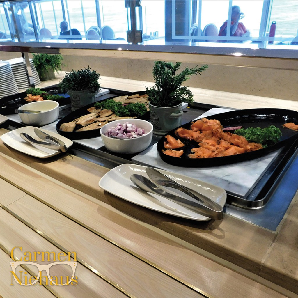 Soggens meld ek so net na 7 aan by die goedtoegeruste gimnasium waar mens of saam met ‘n instrukteur kan oefen of andersins doen ek my eie ding op die vele masjiene terwyl jy oor die voorste dek van die skip uitkyk. Na ‘n vinnige stort, verkas ek na die Lido-eetsaal waar daar ‘n heerlike spread uitgepak is. Tussen die klassieke ontbyte van spek, eiers, omelette en wors is daar heelwat heilsamer opsies om uit te kies, selfs ook ‘n afdeling met glutenvrye keuses – daar is heelwat vars vrugte, Griekse en ander jogurts, die heerlikste gekookte hawermoutpap, granola, compotes en baie neute; gerookte salm en makriel met piekels saam met ‘n verskeidenheid kase en waferbeskuitjies. Ek het ook vir my ‘n pakkie van Carmién se splinternuwe Gut tea ingepak en maak gereeld ‘n koppie. Ons maak ook ons waterbottels vol yskoue water waarmee ons dan dek toe verkas of sommer net daar by ons kajuit op die balkon in die son baai.