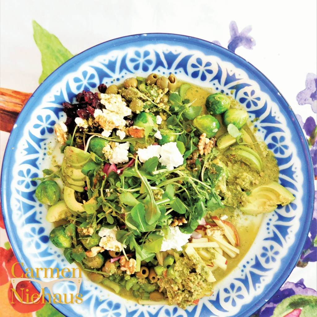 - Rangskil die Brusselse spruite en res van die slaaibestanddele in ‘n slaaibak of bord, giet die orige slaaisous oor. Sprinkel feta en avokado oor