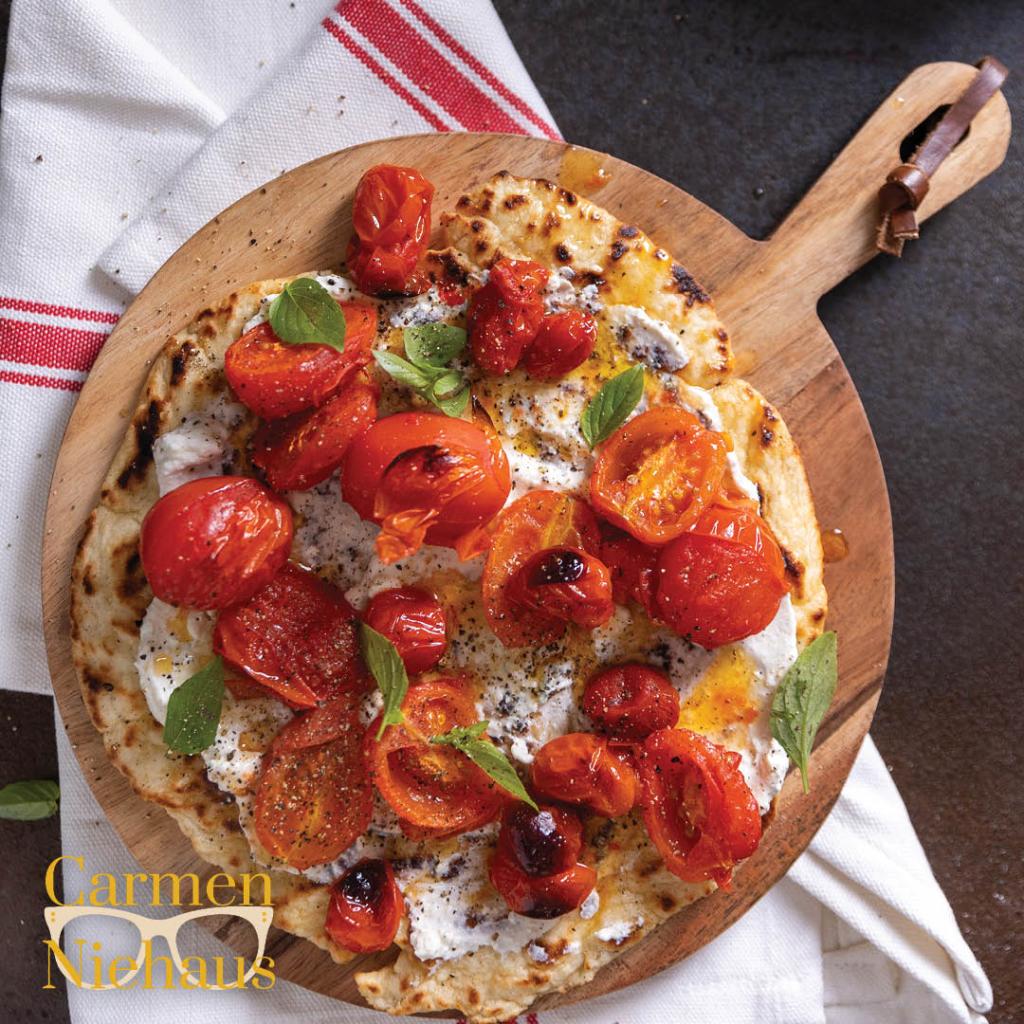 Smeer die platbrode met ’n laag van die fetasmeer en skep van die geroosterde tamaties oor. Rond af met jong basiliekruidblaartjies en olyfolie en sit dadelik voor. Lewer 6-8 porsies.