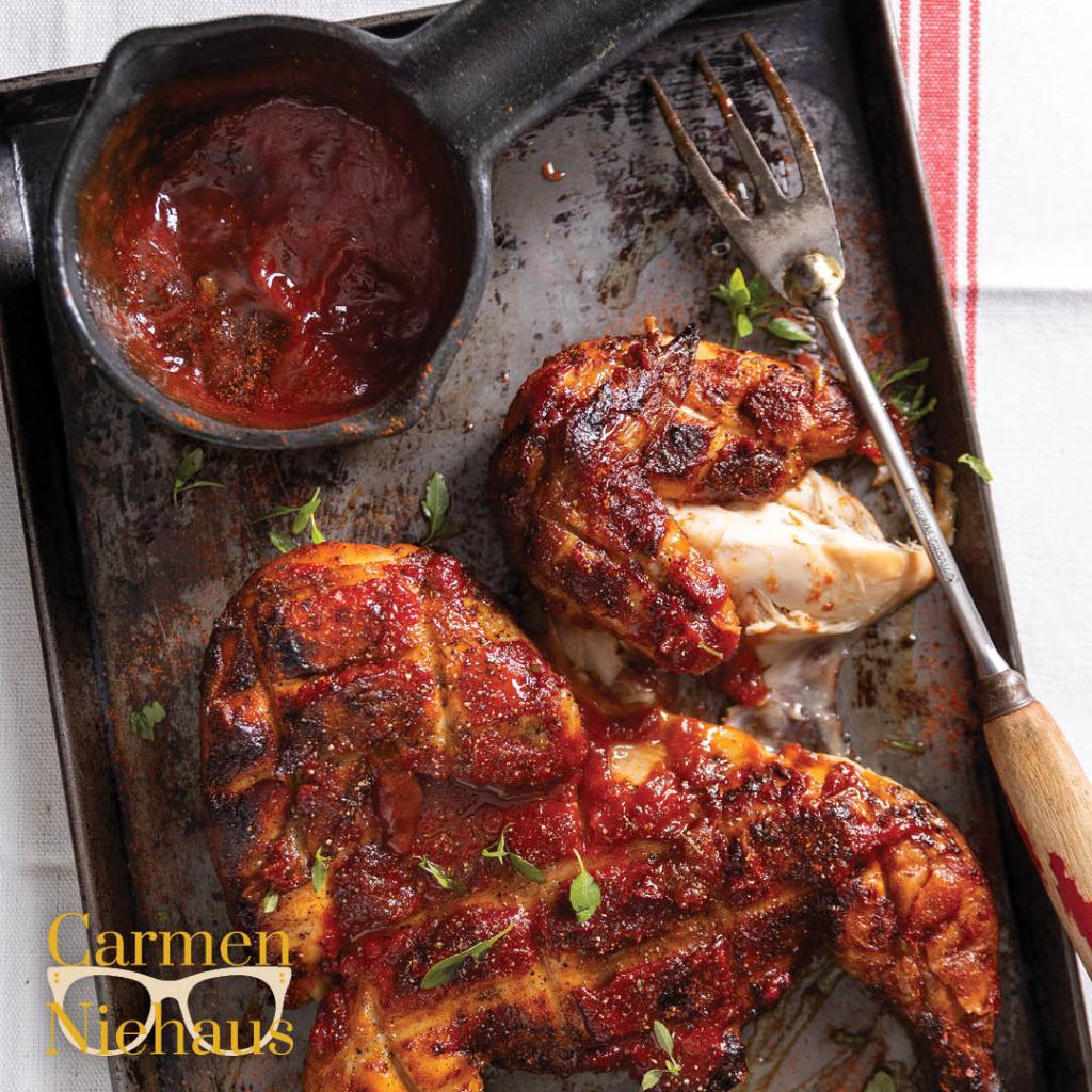 Gebruik ’n skerp skêr en knip die hoender van die borsbeen af tot onder oop. Vou die hoender oop, draai om en druk dit met jou hande plat. Bedruip met olyfolie. Rooster die speserye en sout in ’n droë pan tot geurig en laat afkoel. Vryf die hoender goed daarmee in. Sit die hoender in ’n plastieksak, druk al die lug uit die sak en verseël. Verkoel vir minstens 2 uur, maar verkieslik oornag. Meng al die bestanddele vir die sous.