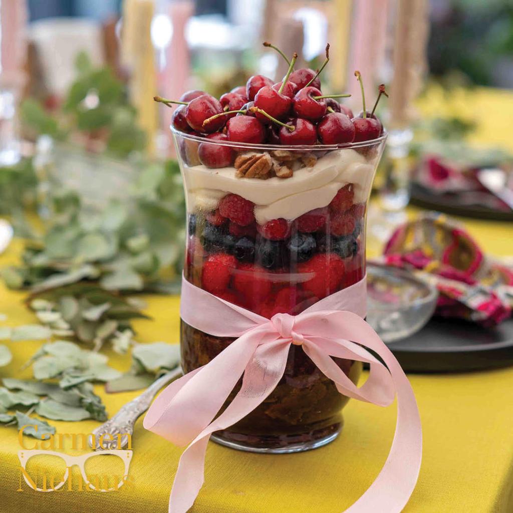 Vanjaar het ek besluit om daardie trifle ‘n slaggie weer af te stof. Die koek het ek geur gegee met Carmién se Floral Berry rooibostee. Dit het ek saam met vars aarbeie en bloubessies in ‘n jellie gestol wat ek ook met die einste Floral Berry rooibostee gemaak het. Bo-op, pleks van room, liggies versoete romerige maaskaas en natuurlik hope vars bessies. Dit vertoon indrukwekkend as jy dit in ‘n lang glasvaas maak sodat mens die lagies mooi kan sien. Skep diep en groot sodat jy al die lekkerte kan proe!