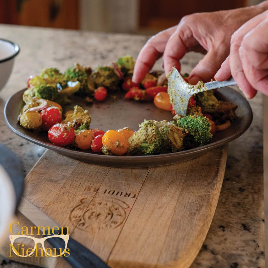 Niks bring my so in die gees van Kersfees soos ‘n pragtige Kerskrans nie – dit kan maar net eenvoudig getooi wees in groen of grys blare of andersins milddadig versier met linte en kersbolletjies. Bring die Kerskransidee tafel toe en maak ‘n slaai wat in ‘n kerskransvorm gepak is – groen en rooi met broccoli en sonrooi tamaties. Die slaaisous is heerlik met songedroogde tamaties waarby ‘n tikkie gemmer en brandrissie gevoeg is in die vorm van Carmién se Revive groen rooibostee. Pragtig om kleur en geur aan die kerstafel te verskaf.