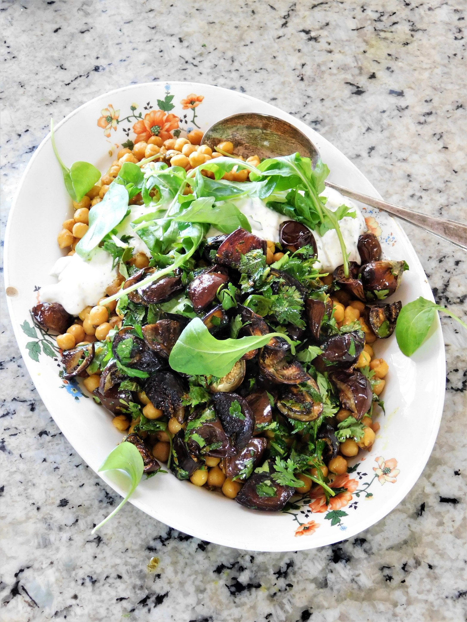 Moroccan chickpeas with a leafy aubergine salad & spiced yoghurt