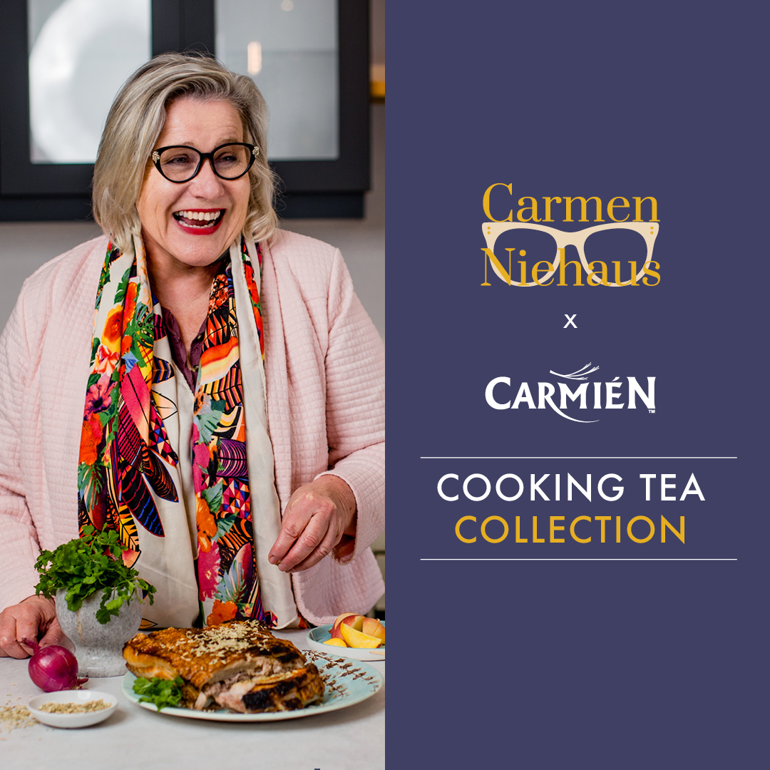 Ek het julle seker nou lank genoeg aan ‘n lyntjie gehou oor waarmee ek doenig is in die kombuis. En hier is dit nou – die CARMEN NIEHAUS COOKING TEA COLLECTION. Twee bokse met my noukeurig uitgesoekte teeseleksie uit die Carmien-teereeks waarmee ek heeldag en aldag lank in die kombuis kook. Ek noem dit my “spice cupboard in a tea bag”!