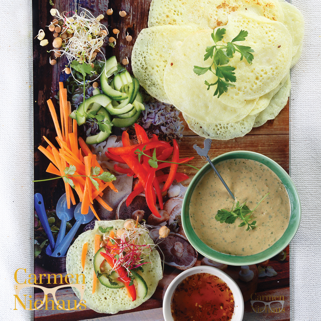 Hierdie nuwerwetse Vietnamese pannekoekies met sy geurige groentevulsel en grondbone-doopsous is ideaal, ook omdat dit boonop glutenvry en vegetaries is.