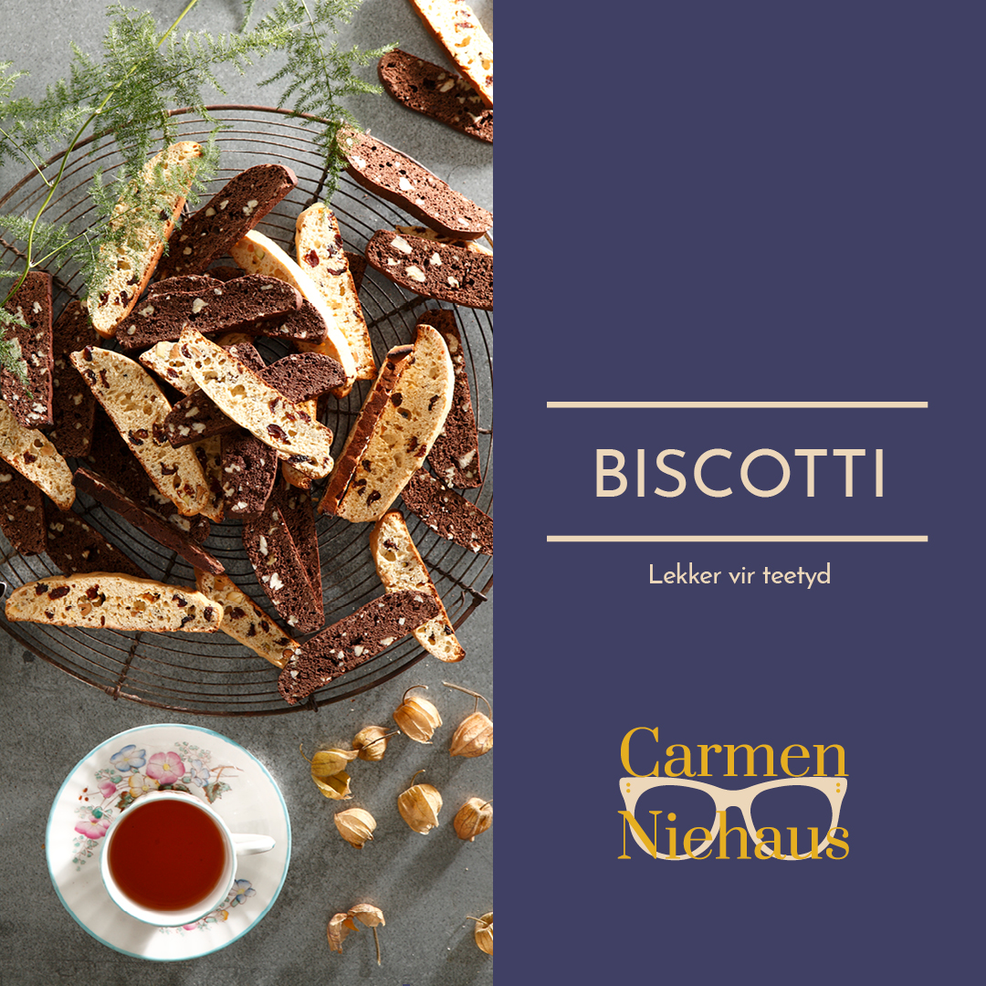 Ek het nou al vertel van die eindelose teedrinkkuiers wat ons gereeld saam met my ma op die noordestoep van haar huis meemaak. Spesiaal vir ons stoepkuiers, bak ek hierdie biscotti – die resep is lekker veelsydig en jy kan verskeie soorte van sjokolade- amandel – tot gemmerbiscotti maak.