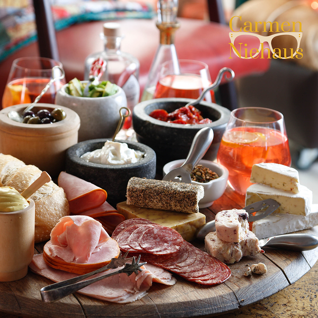 Van ons voorstoep af kyk mens lekker uit op die Langebaanmeer. Onder die lattedak staan daar ‘n groot stewige houttafel met bankies. Lanterns wat al om die kante van die stoep hang, gee net genoeg lig. Dis nou al tradisie dat ons Oujaarsaand saam met familie en ‘n paar vriende op die lekker groot stoep kuier, want hiervandaan kan ons die vuurwerke mooi bekyk. Dis dan wat ek graag groot houtborde met charcuterie en kase uitpak saam met lekker brode en ‘n paar smere. Ek gebruik sommer baie keer ‘n klompie vysels om die eetgoed in uit te sit. Eenkant prakseer ek ‘n ginstasie waar almal kan eksperimenteer met mengeldrankies.